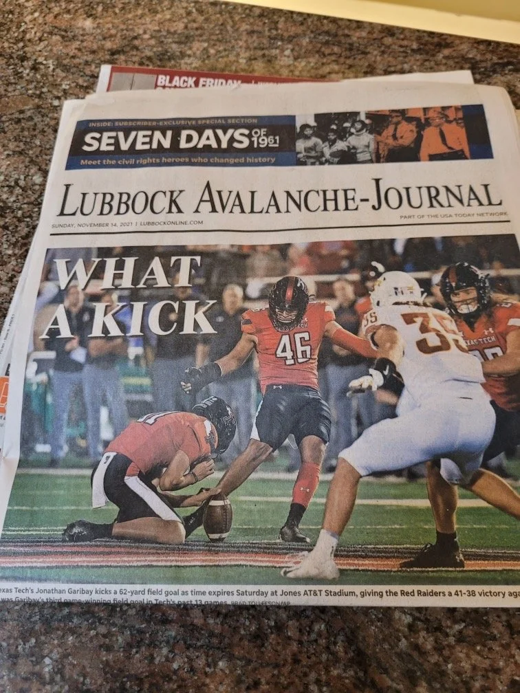 The headline in the print edition of Sunday’s Lubbock Avalanche-Journal was “WHAT A KICK.” I felt that on multiple levels. WHO-TV’s SoundOFF show dubbed it a “Kick in the guts.”